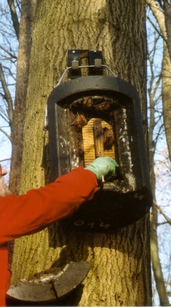 Aufhängung: Baum- und forstgerecht durch Alunägel und zwei Aufhängeklötzchen mit gleichzeitigem Sicherungs- und Herausfallschutz am Bügel und an der Vorderwand. Optimale Hanghöhe mindestens 3 Meter. Ein freier Einflug beschleunigt den Ansiedelserfolg.