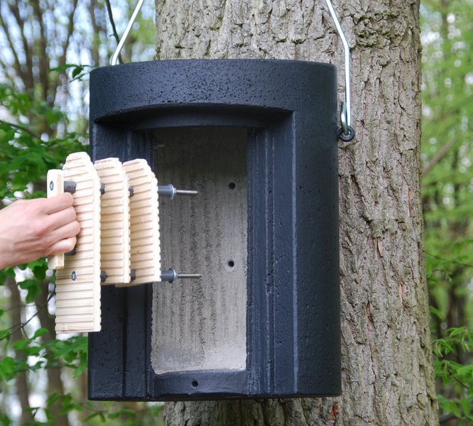 Die Kolonie- und Überwinterungshöhle basiert auf dem Innenraum der 1FS mit den dreifach aufgesetzten und geriffelten Holzplatten als Hangmöglichkeiten und Spaltenquartier. Zusätzlich bietet aber die 1FW durch das patentierte Doppelwandsystem mit mehreren Dämmstoff-Schichten eine unübertroffene Isolierung im Winter. Trotzdem ist durch das atmungsaktive Material und die Zwangsbelüftung ein sicheres Überwintern der Fledermäuse gewährleistet.