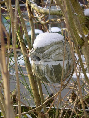 Reinigung/Kontrolle: Wir empfehlen von Kontrollen im Zeitraum von April bis Juni abzusehen, um die Brut nicht unnötig zu stören. Die Reinigung der zweischaligen Nisthilfe sollte daher bevorzugt in den Herbst- oder Wintermonaten stattfinden. Zum einfachen Säubern kann das Halteseil entfernt und die obere Kugelschale leicht von der unteren abgehoben werden. Nach der Reinigung einfach die beiden Hälften wieder zusammenfügen und mit dem Halteseil sichern.