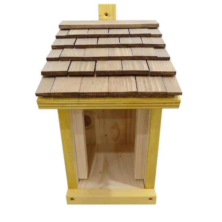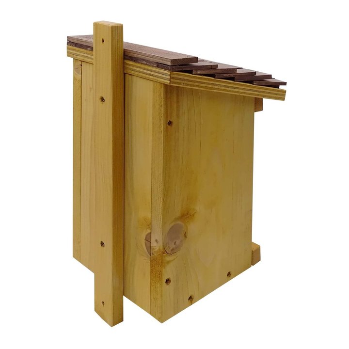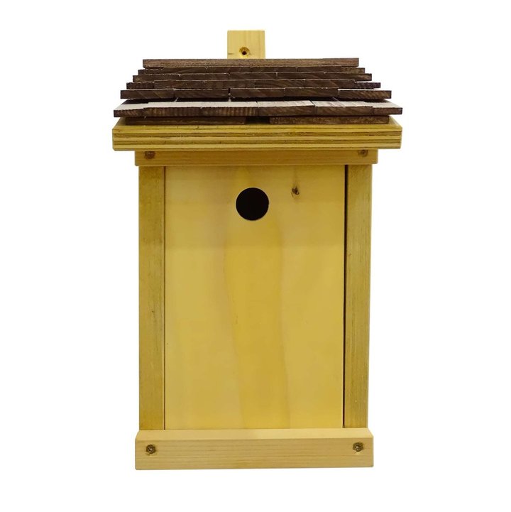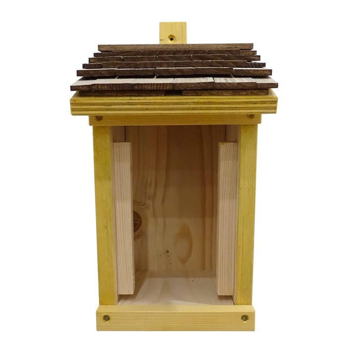 Das mit dunkel lasierten Schindeln gedeckte Dach hebt sich optisch sehr schön vom hellen Korpus ab. Alles ist von uns bereits mit einer umweltfreundlichen Holzschutzlasur behandelt, Sie brauchen es nur noch aufzuhängen. Suchen Sie sich dafür am besten einen halbschattigen Platz in Richtung Südost. Sie können diesen Nistkasten einfach an der an der Rückseite montierten Holzleiste befestigen. Schrauben und Dübel liegen selbstverständlich bei.