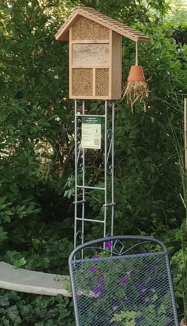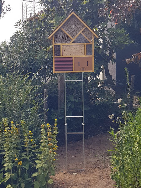 Diese Halterung ermöglicht das einfache, sichere und dekorative Aufstellen Ihres Wildbienen- oder Insektenhotels. Hier können z.B. Kletterrosen, Clematis etc. hochwachsen und dienen den Insekten direkt als Futterpflanzen.